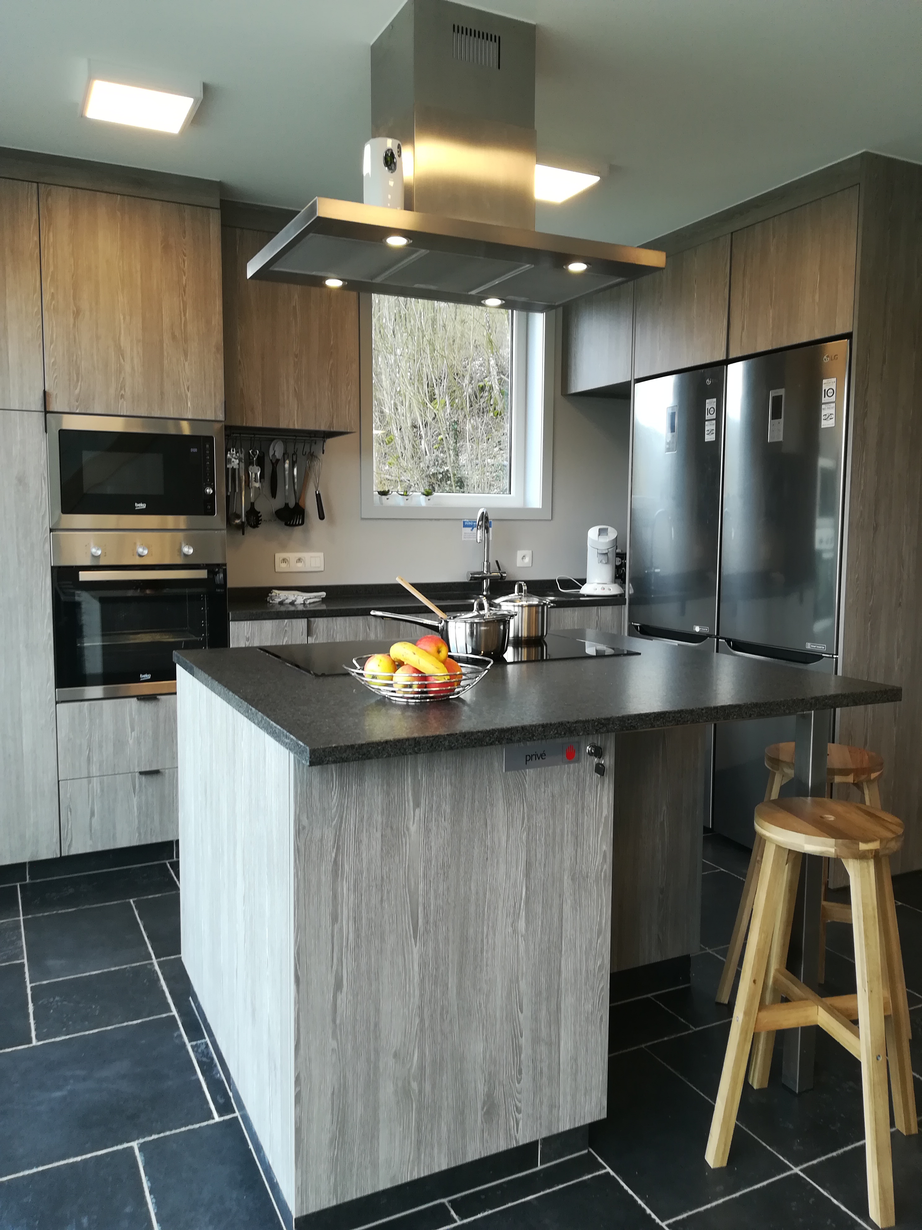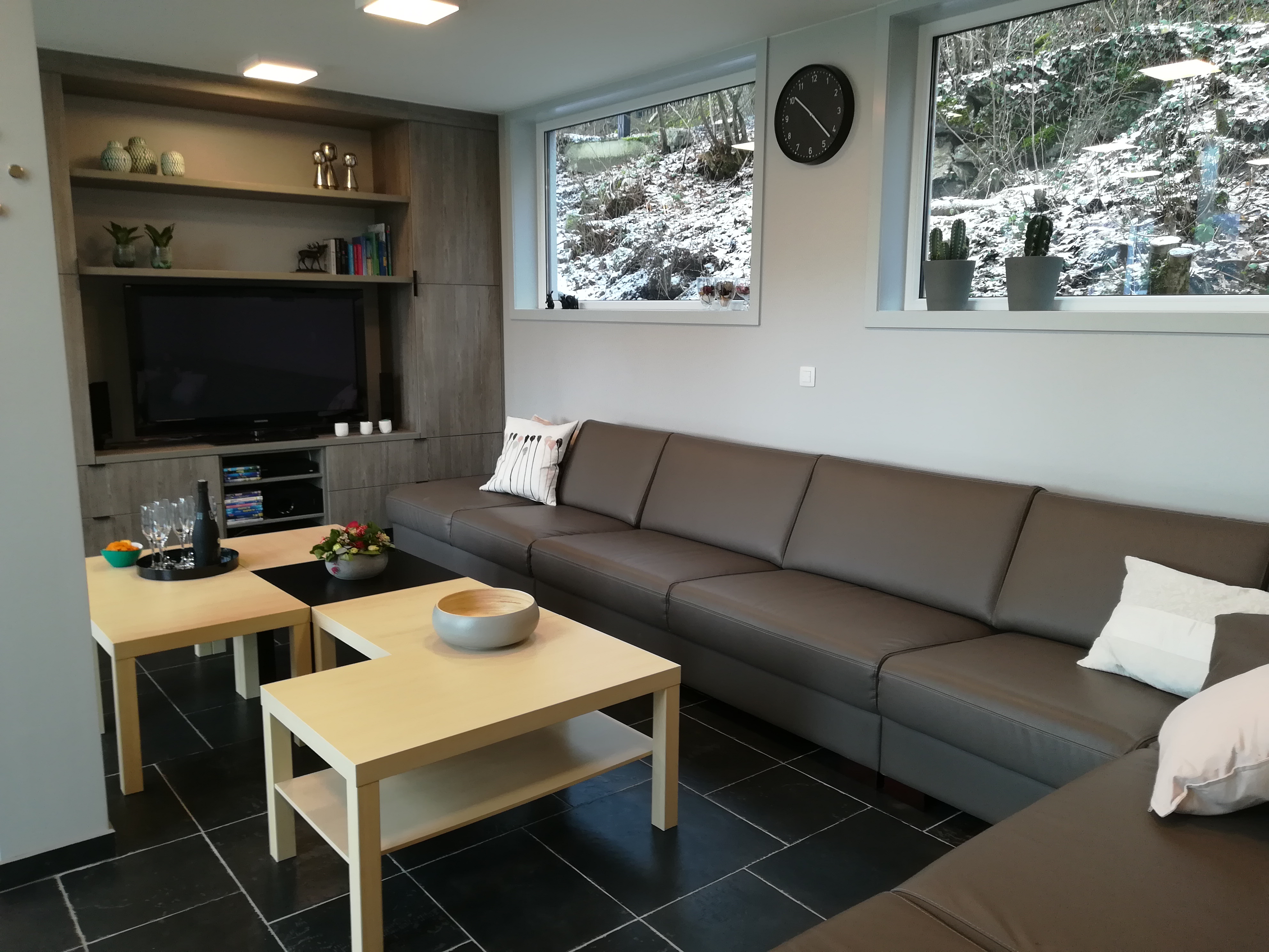 In de ruime hoekzetel met grote tv – inclusief WII– ploft iedereen gezellig neer. De tv heeft een ‘VOO’, vergelijkbaar met een Telenet Digibox.