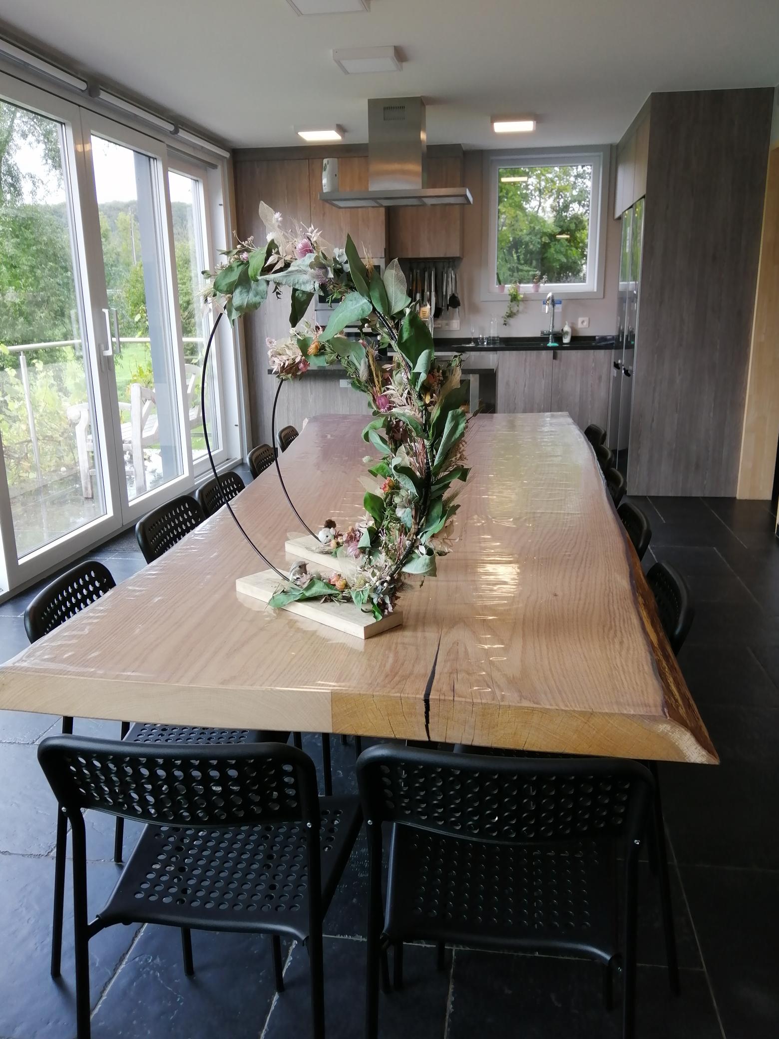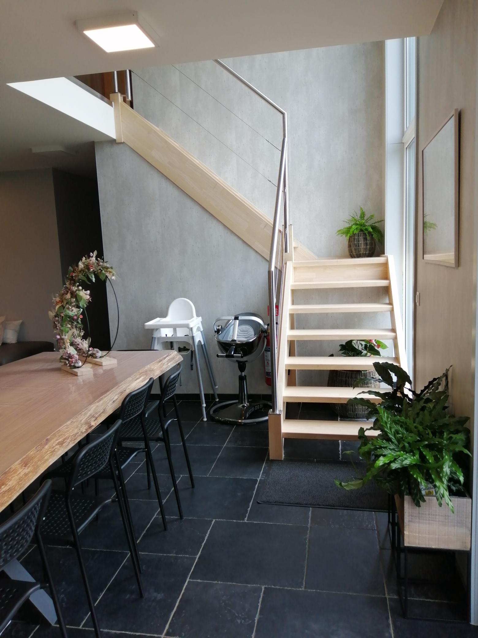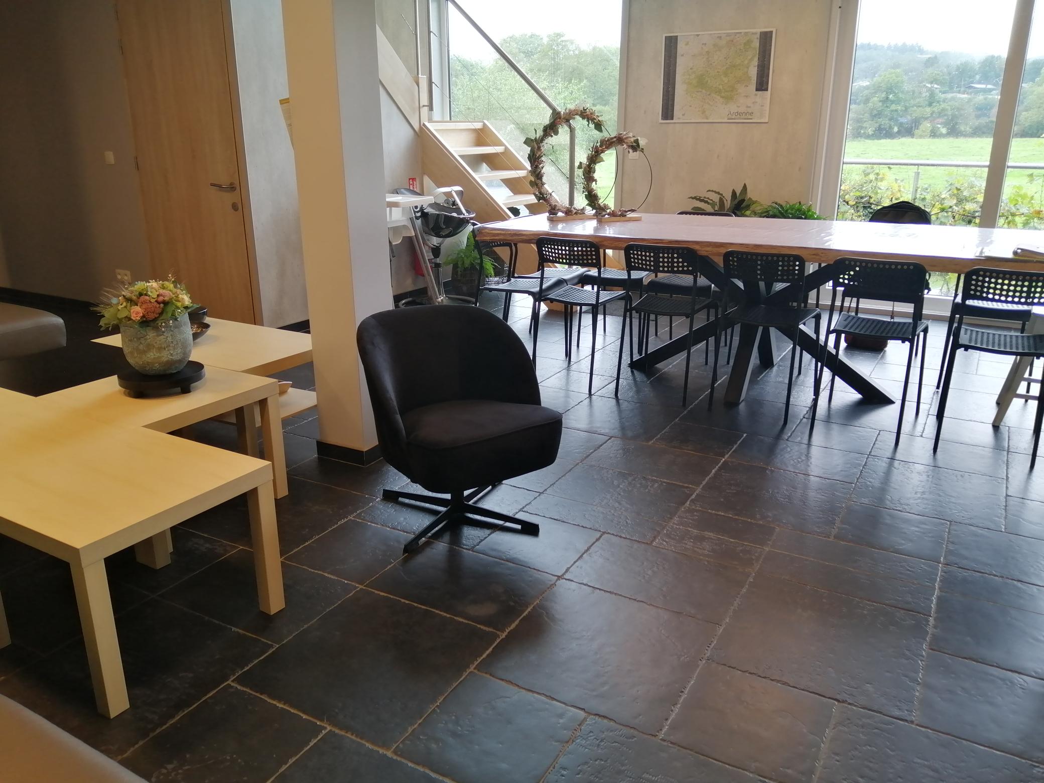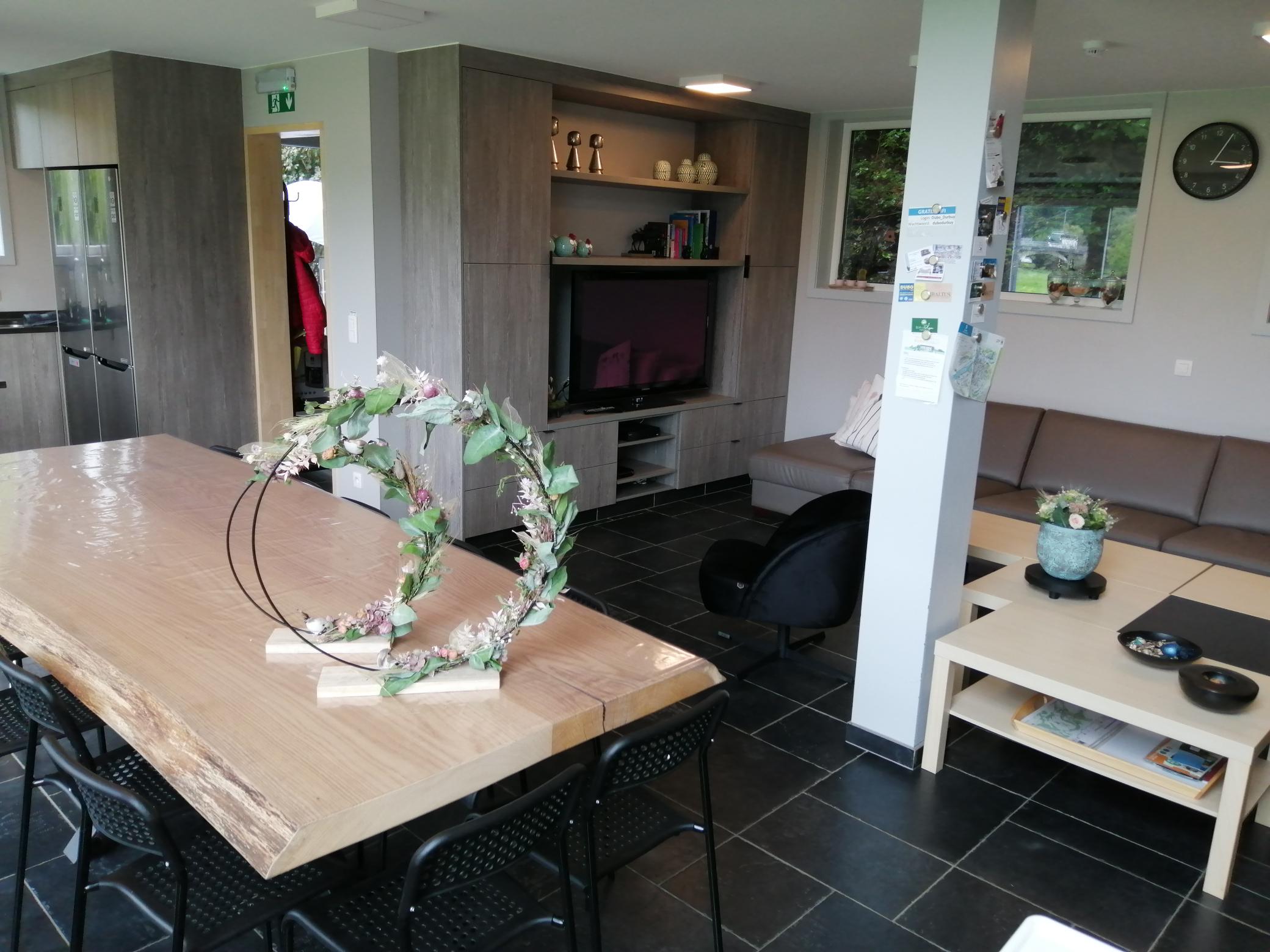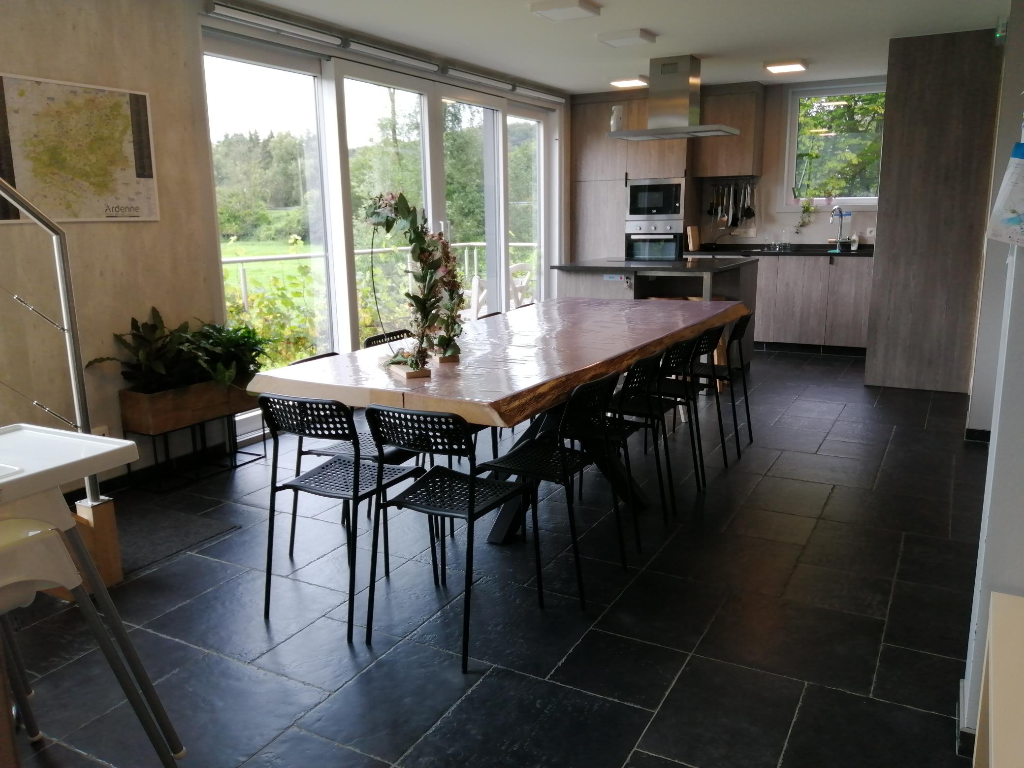 In de leefruimte vind je 1 grote eiken tafel met plaats voor 14 stoelen. De babystoelen kunnen bijgeschoven worden.