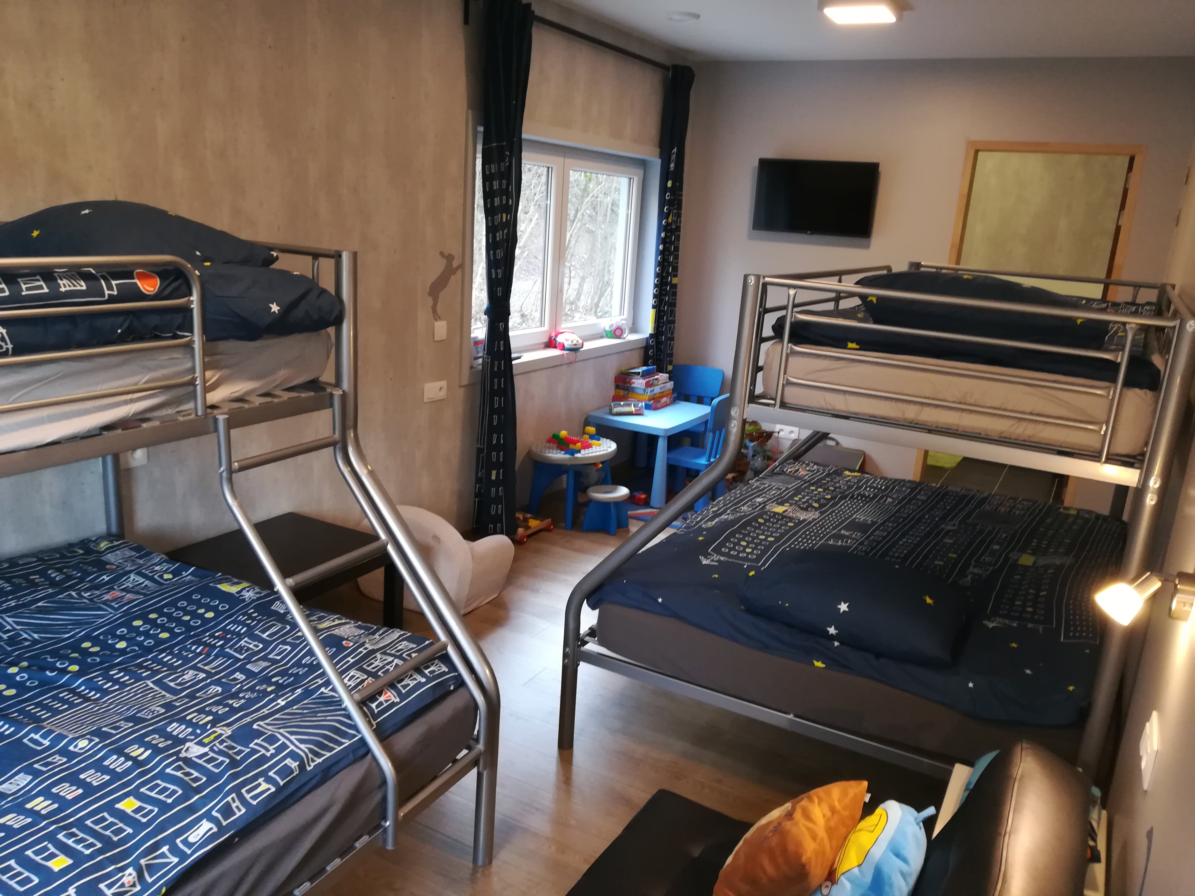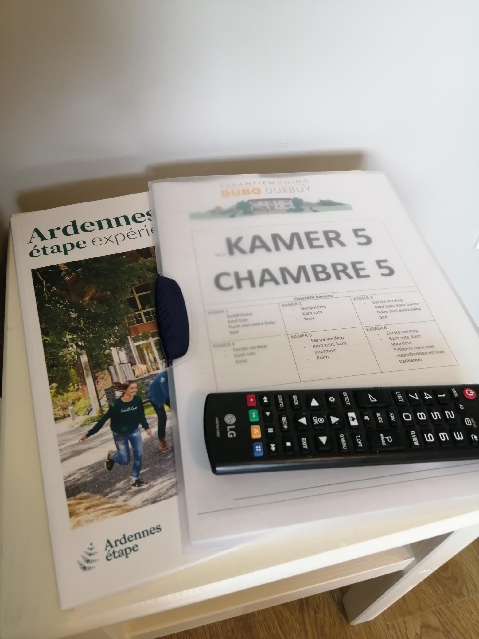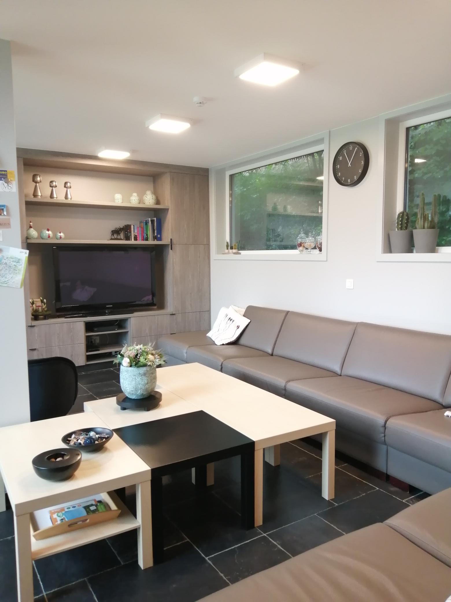 In de ruime hoekzetel met grote tv – inclusief WII– ploft iedereen gezellig neer. De tv heeft een ‘VOO’, vergelijkbaar met een Telenet Digibox.