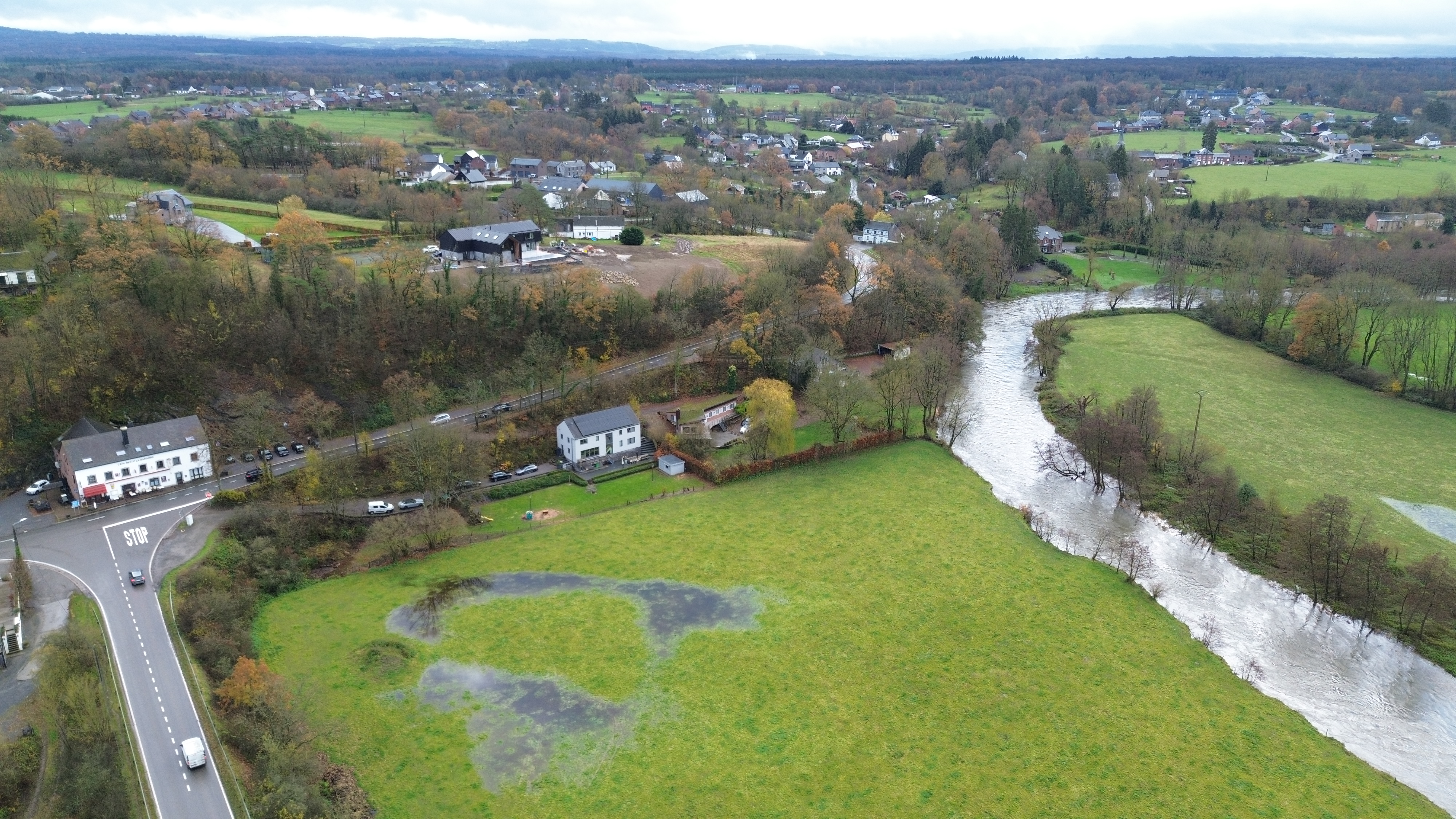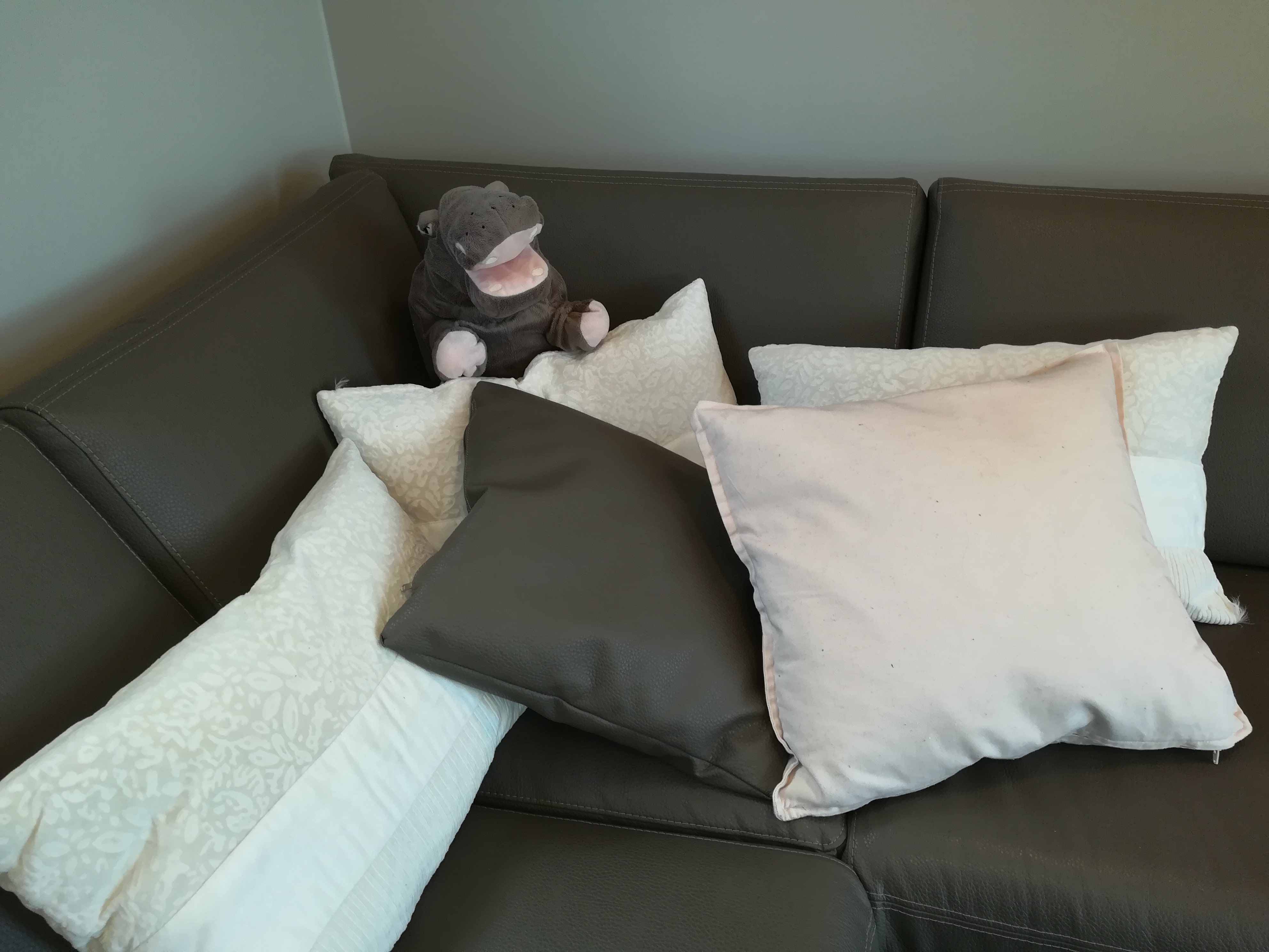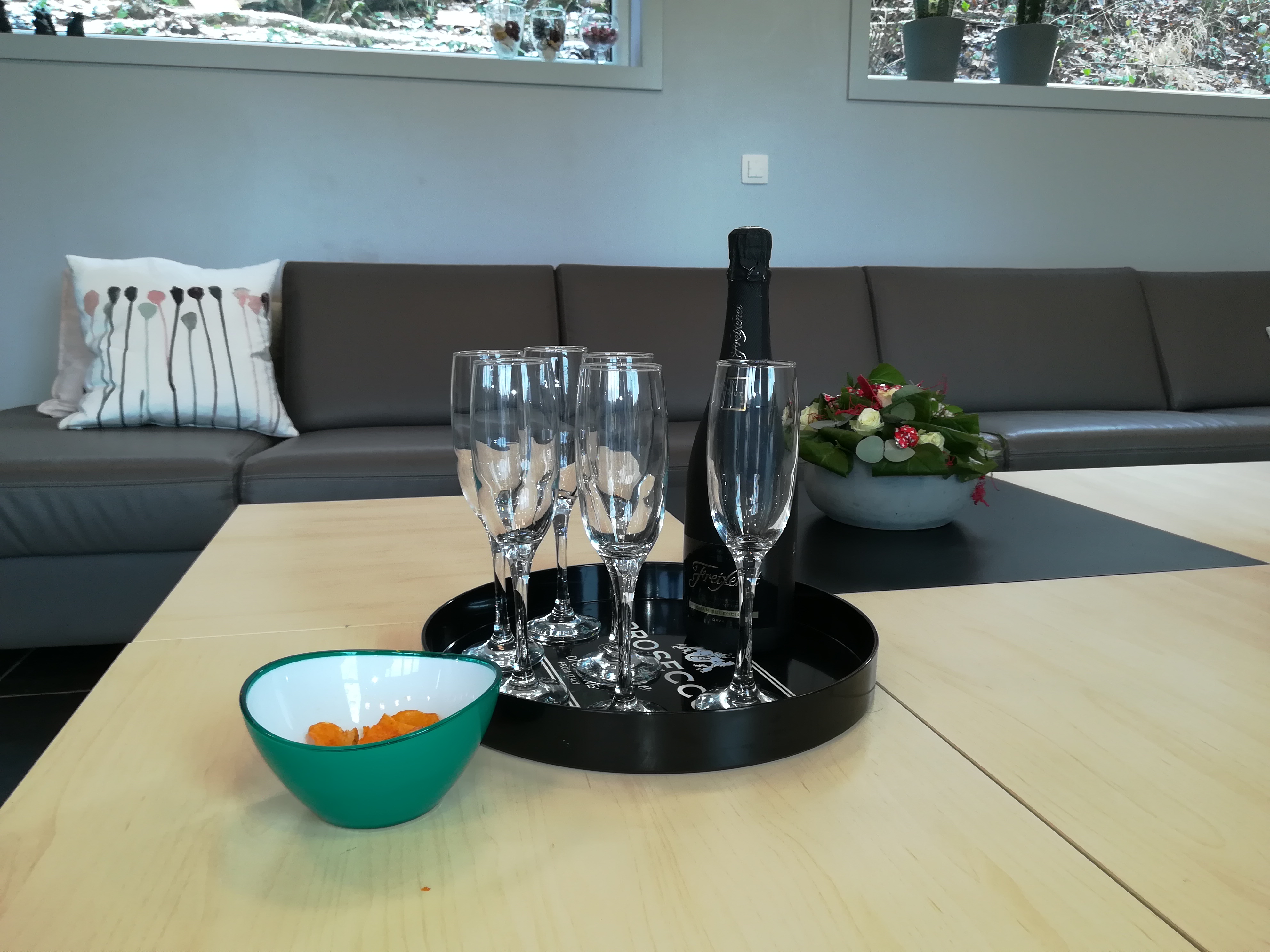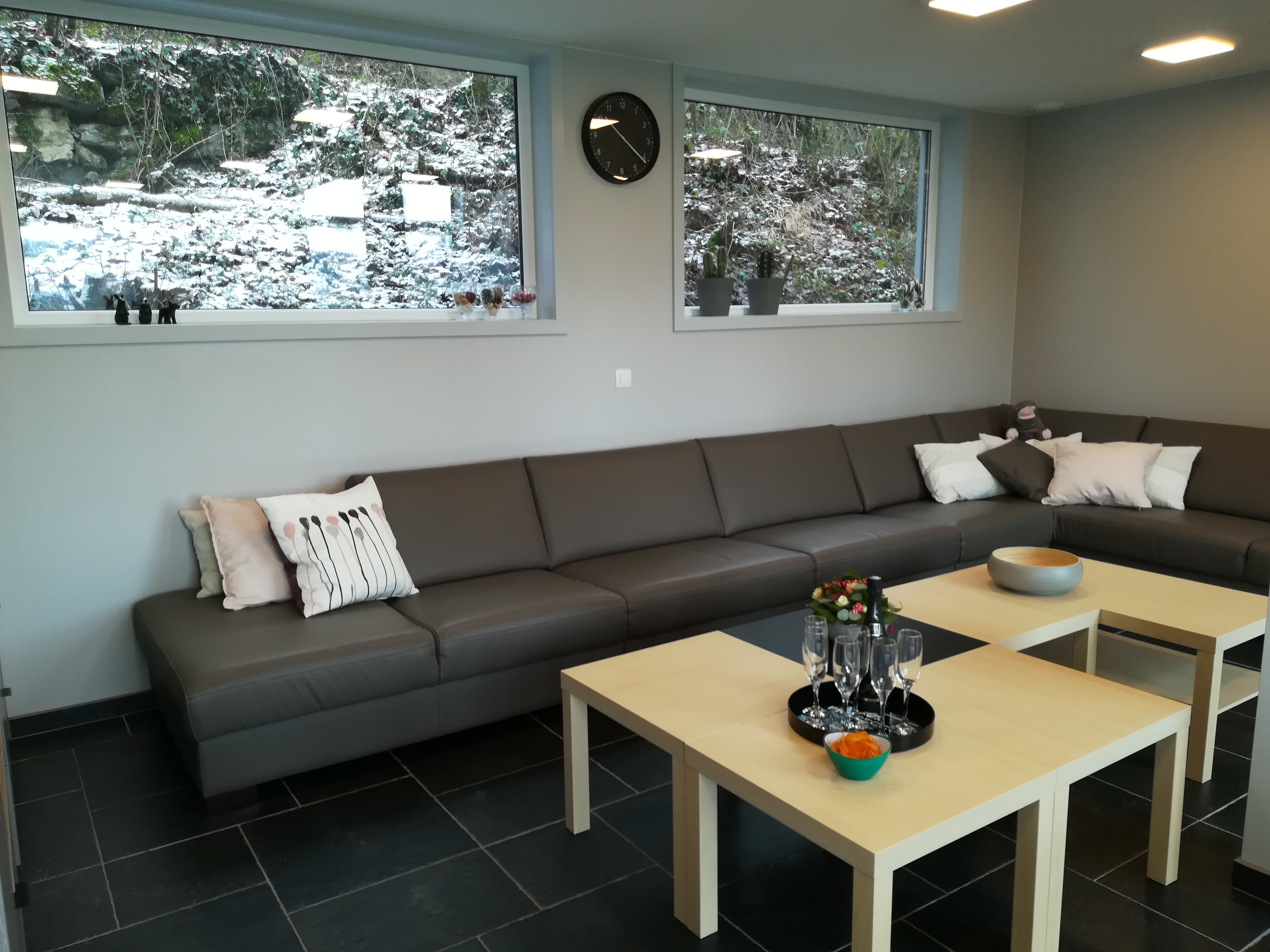 In de ruime hoekzetel met grote tv – inclusief WII– ploft iedereen gezellig neer. De tv heeft een ‘VOO’, vergelijkbaar met een Telenet Digibox.