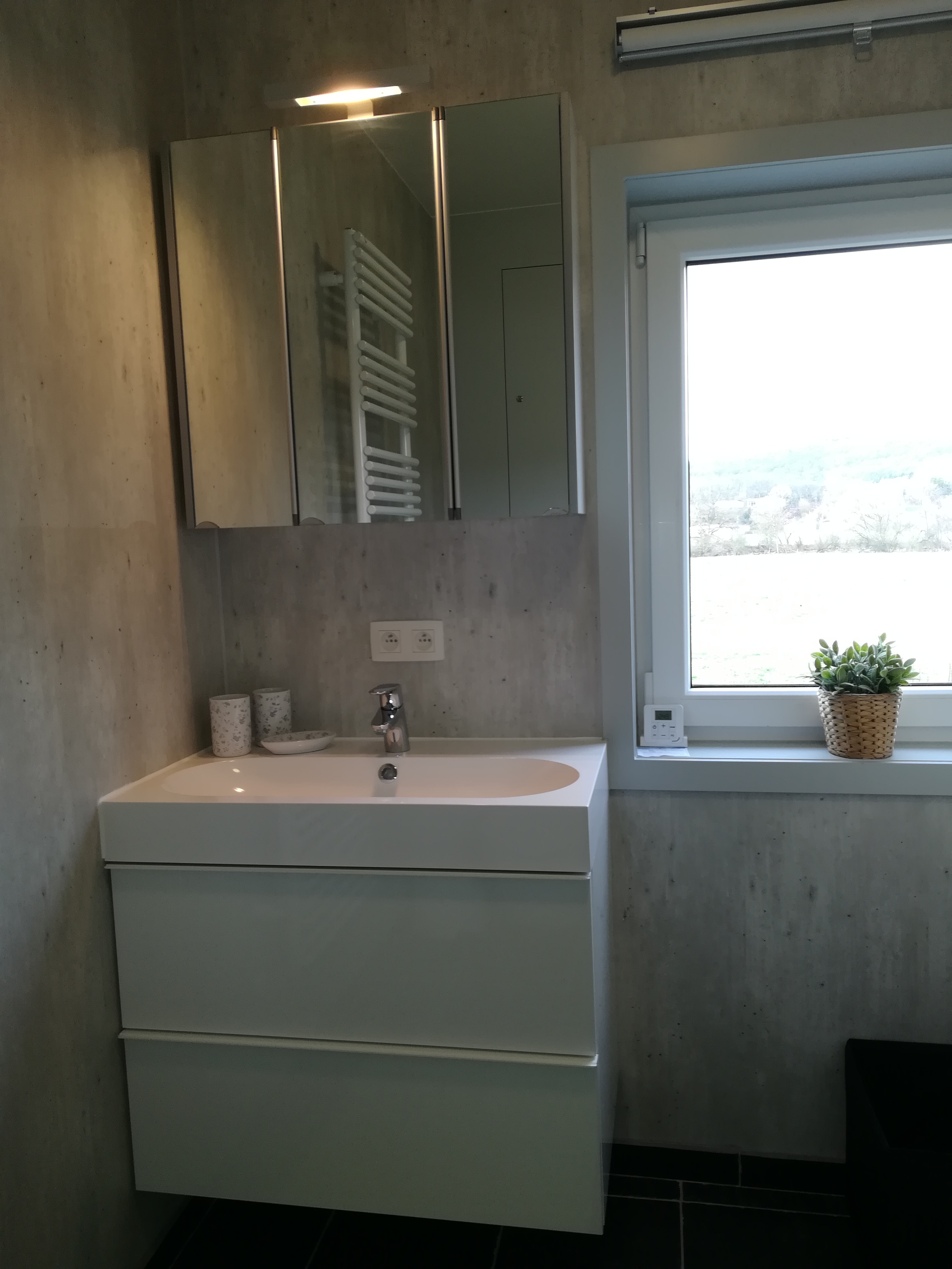 De leefruimte staat in nauw contact met buiten. Tijdens de zomermaanden kunnen binnen en buiten perfect met elkaar versmelten als je het grote schuifraam openzet. Via het balkon kan je naar de tuin en het grote terras.