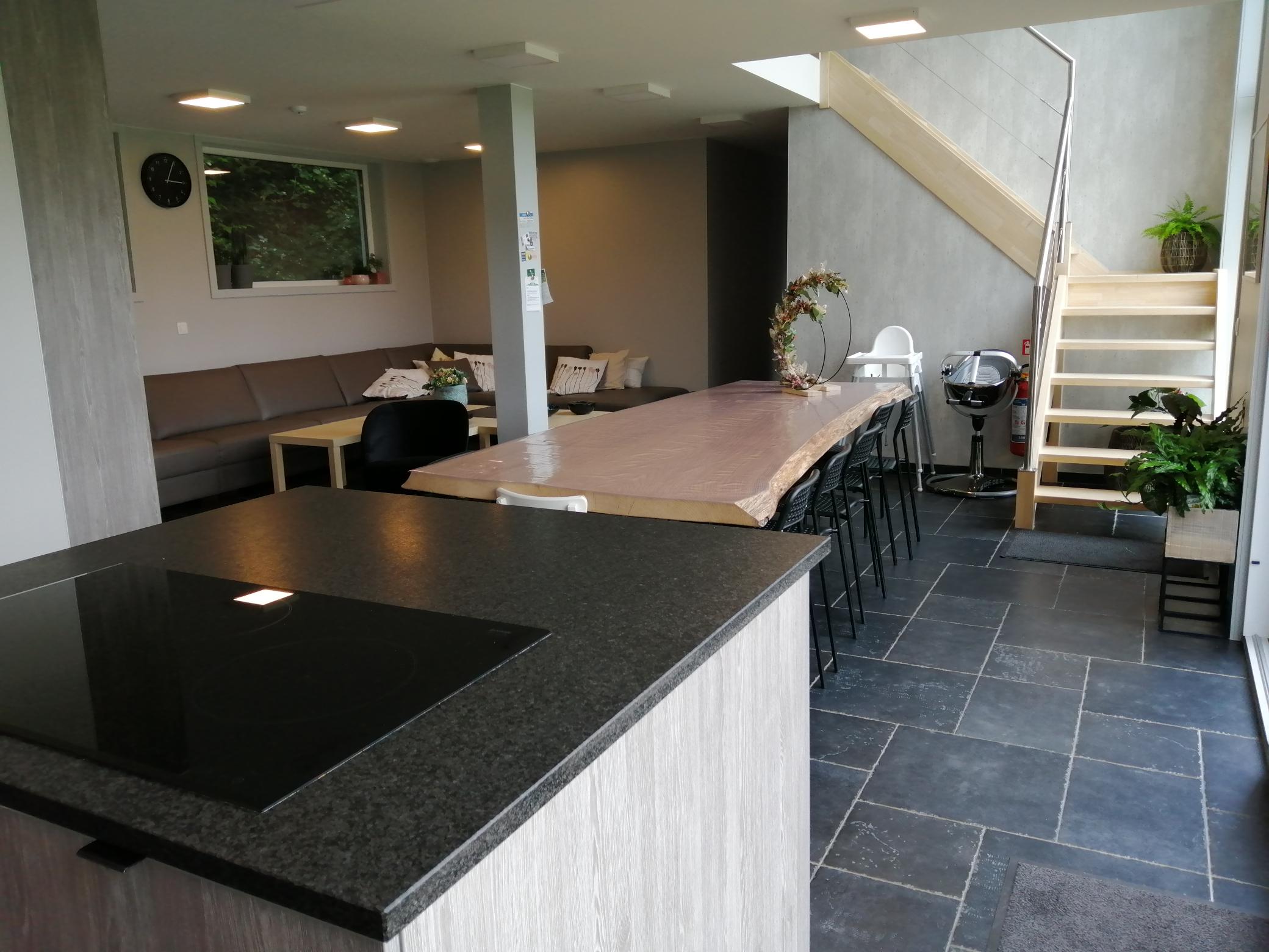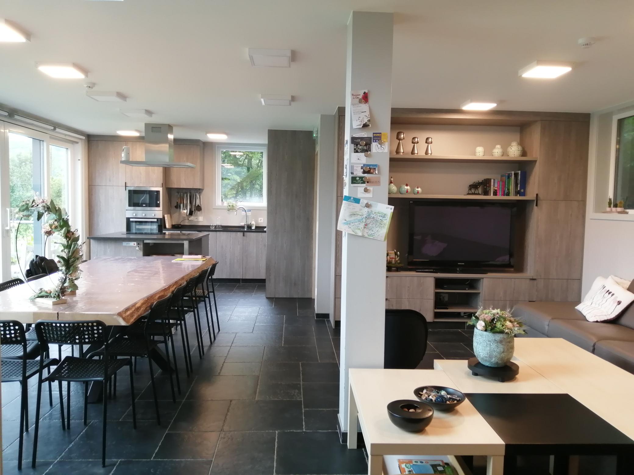 In de leefruimte vind je 1 grote eiken tafel met plaats voor 14 stoelen. De babystoelen kunnen bijgeschoven worden.